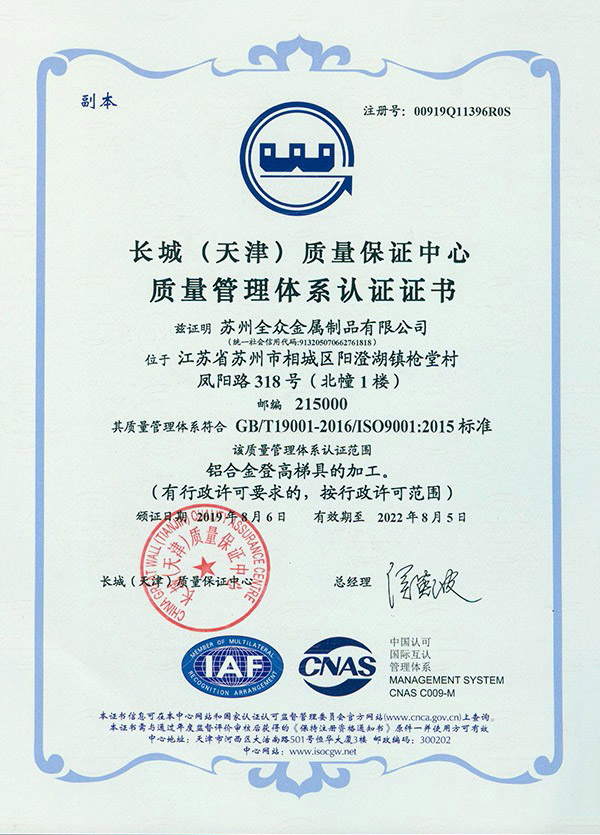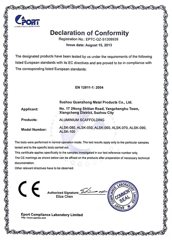 博鱼平台专注铝合金制品的开发“产品就是人品”的企业理念,不断进行技术创新、设备创新、服务创新、和管理方式创新来继续研发出更多满足未来发展需要的产品, 公司产品通过欧盟认证取得CE认证并取得证书,铝合金脚手架系列产品通过SGS认证,铝合金平台和梯具类产品均严格按照GB12142-2007,GB17888等标准设计生产。